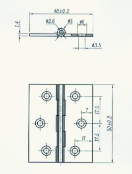 Butt Hinge, 50x40x1,4mm, Brass Sanded, ø3,5mm Holes