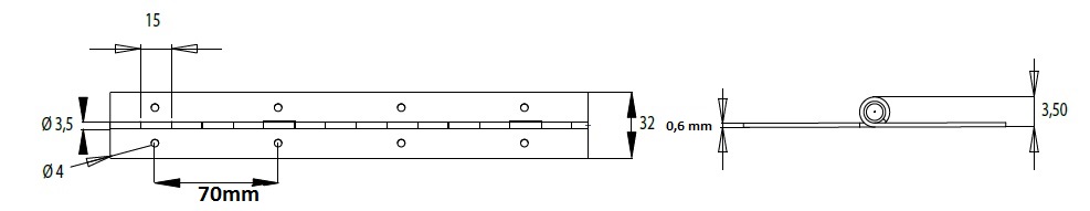 Piano Hinge, 32 x 0,6 x 3500mm, Steel Brass Pl., cc 70mm