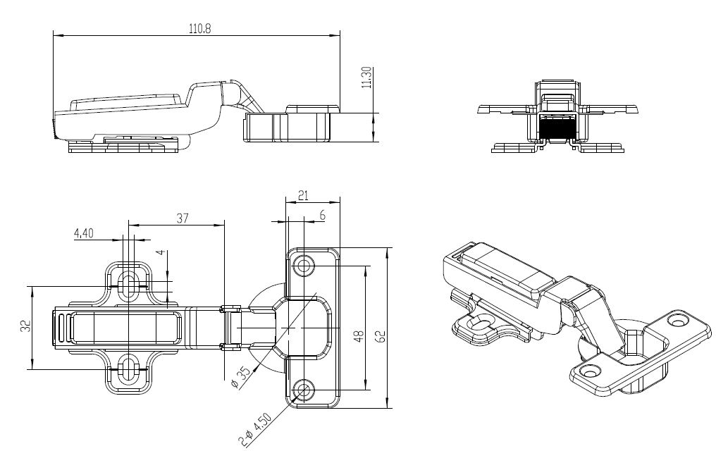 Maxi Hinge "B", Clip-On, 100DG, NPL, ø35mm, H=0, W/Plate F/ Wood Screws, Cup: cc:48mm, Half-Overlay, W/SISO Name Plate, Can Be Used Together With 15.03.732-5