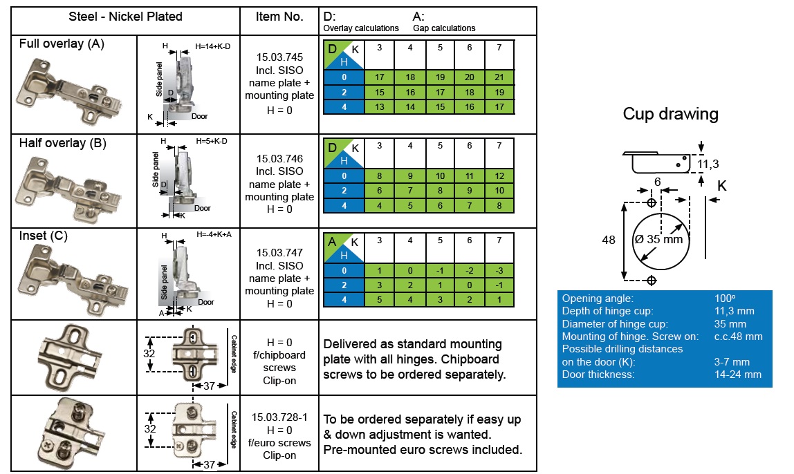 Maxi Hinge "PTO" , Clip-On, 110DG, NPL, Full-Overlay,W/Plate H=0, F/Chipboard Screws, Cup: cc:48mm, W/SISO Name Plate, Perfect To Be Used With Touch/Spring Latches