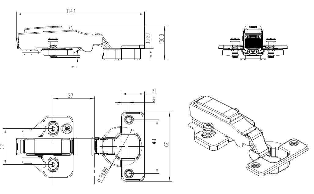 Soft Closing Hinge "A",ø35mm,Clip-On,H=0,Plate W/Euro Screws W/Pre-Mounted Euro Screws 6.3x14mm, Full-Overlay, 100DG, Cup CC:48mm, Mounting Plate H:0mm. Easy Adjustment, W/SISO Name Plate, Hydraulic Plastic Pump