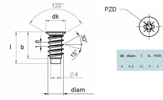 Euro Screw, 6.3 x 11mm, Flat Head, BZP, CSK, PZD