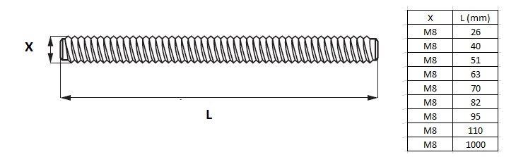 Threaded Bolt M8x40mm, Steel, Bright Zinc Plated