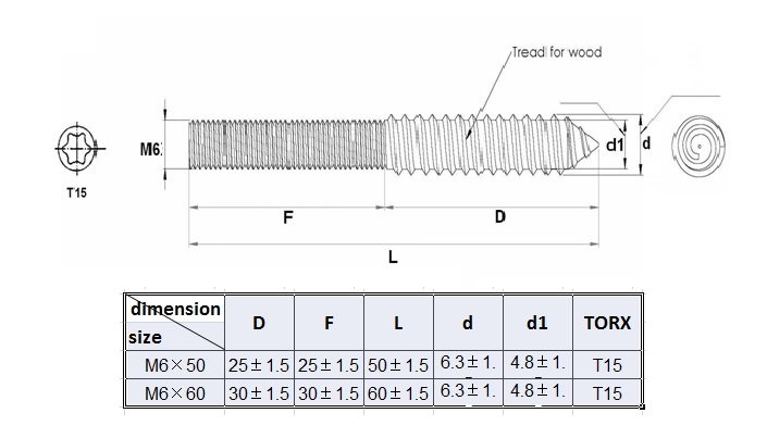 Hangerbolt, Cylindrical, M6x60mm, 50/50, Steel-YZP