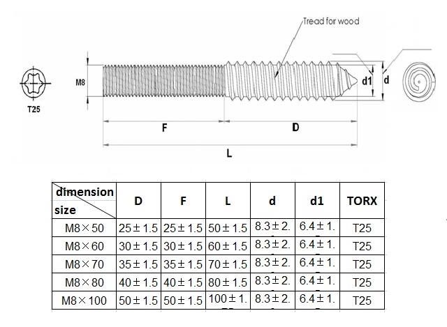 Hangerbolt, Cylindrical, M8x60mm, 50/50, Steel-YZP