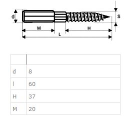Hangerbolt, Cylindrical, M8x60mm, Stainless Steel A2, 20/37
