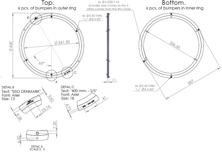 Lazy Susan Alu. Swivel, ø401x12mm, ID 338mm, ø6mm SS-Ball Bearing, Load Capacity: Max 100Kg, 4 CSK Holes, 6 White Rubbers ø10,2 x 3,3mm on each side