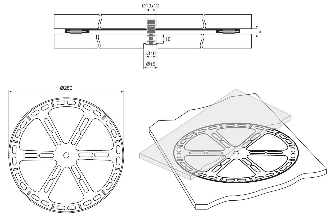 Swivel Plate, ø280mm Black Plastic, ø10.5mm Screw Hole, NO Bushing or Bolt. To be bought Seperately. Item 16.15.235 & 16.15.230