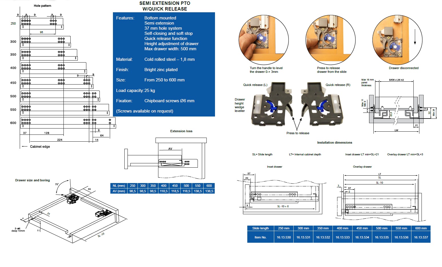 Invis. Semi Ext. Slide, Self closing, Pre-Zinc,300mm,W/Quick Release & Inner Dampers