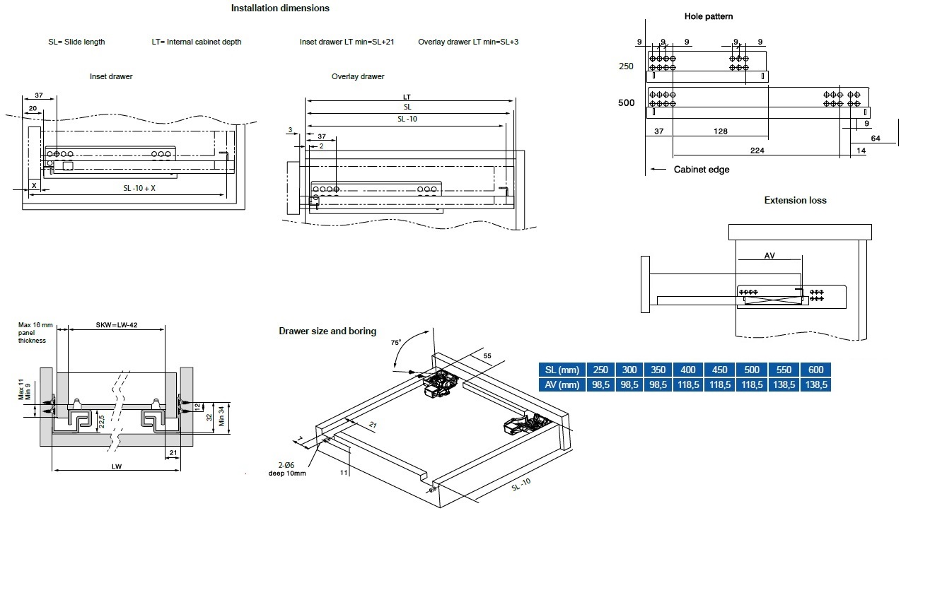 Invisible Semi Extension PTO, 500mm, Pre-Zinc, W/Quick Release Handles, Max Drawer Width:500mm, Load Capacity:25Kg