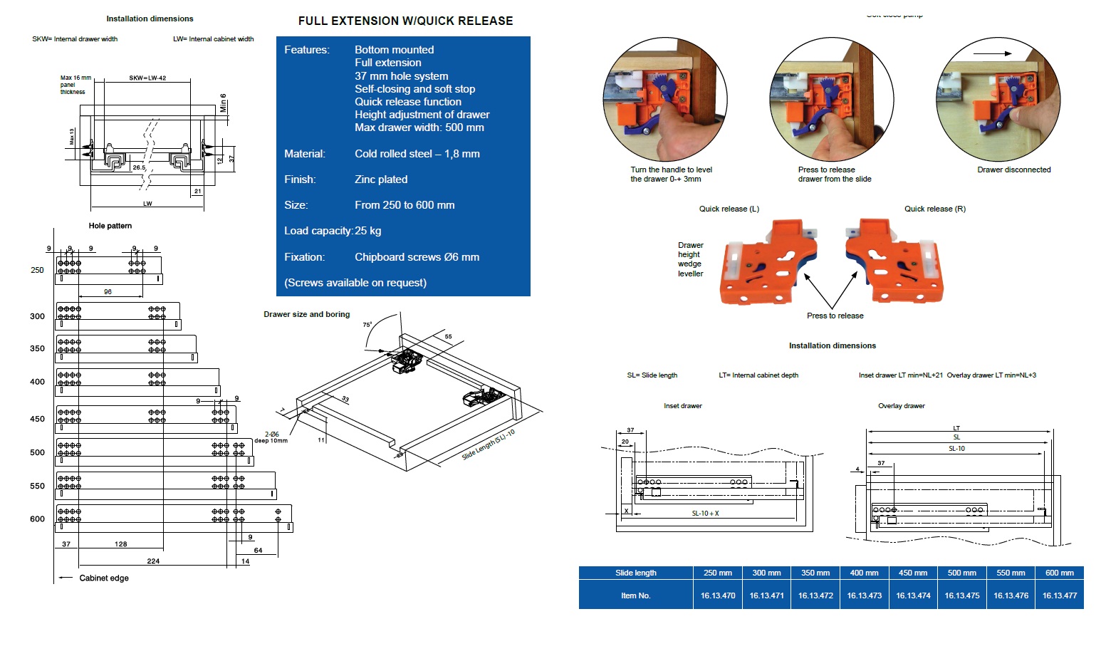 Invis. Full Ext. Slide, Self Closing, BZP, 600mm W/Quick Release Handles & Soft Close Pumps Pre-Installed