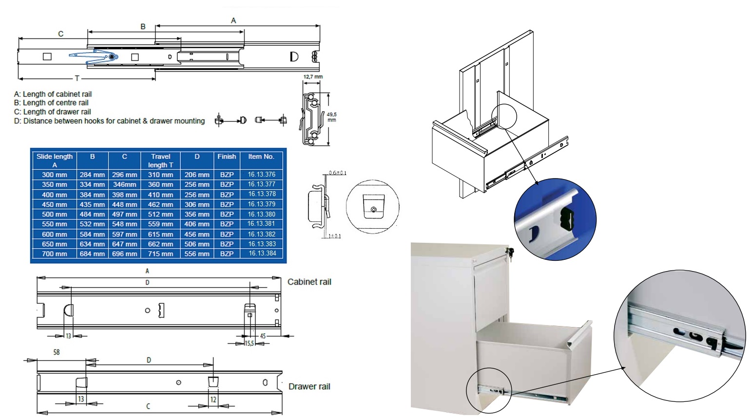 Drawer Slide ME4950, 600mm, Hooks w/Locking Knob, BZP, F/ Metal Cabinets, Hook Distance: 456mm