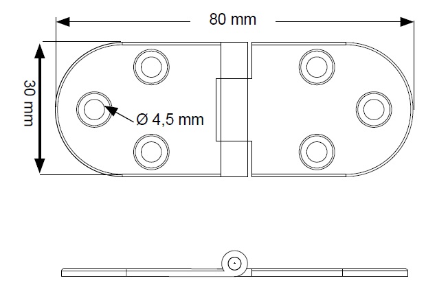 Flap Hinge, Brass, 30x80x2mm, Sanded, W/CSK ø4,5mm Holes
