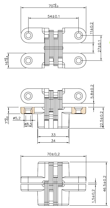 Vici Hinge, Zamak, 70x16mm SS Linkage, SS-Brushed, W/Screws
