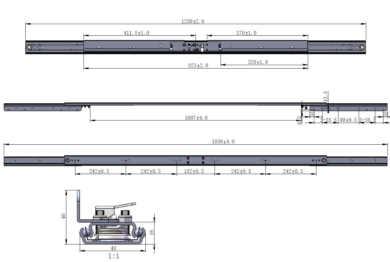 Synchron Slide 1250/1007 Opening 1007mm, W/Brake, Total Open Lenght:1830mm, Closed Lenght:1250mm, Opening:1007mm Profile Height: 48mm, Wing Size:370mm, Metal Brake, Steel Thickness 1,5mm, Steel, Load Capacity 90 KG