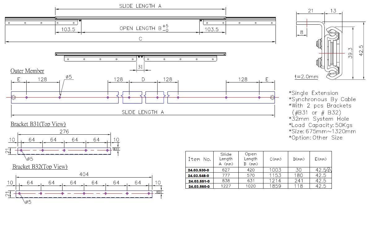 Synchron Slide B 1227/1020, Opening 1020mm, Wing 404mm, Total Open Lenght:1859mm, Closed Length:1227mm,Load Capacity 45 KG