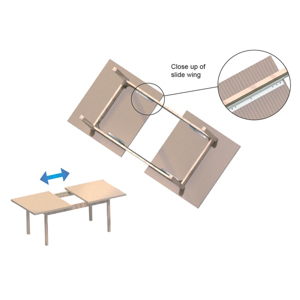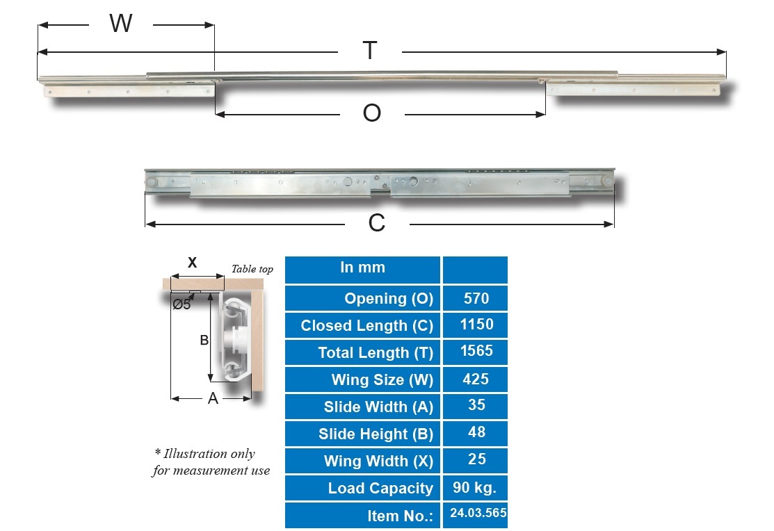 Synchron Slide S 1150/570, Opening 570mm, Wing 425mm, Total Open Lenght:1565mm, Closed Lenght:1150mm, Load Cap. 90 Kg. Profile Height:48mm, Mounting Heigth:50mm, Steel Thickness 2,0mm
