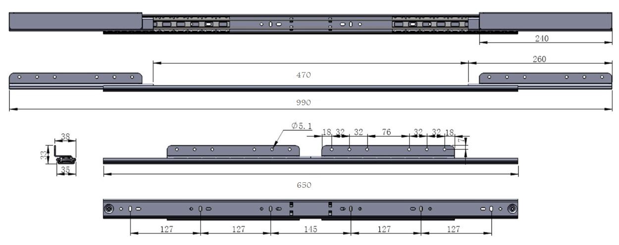 Synchron Slide S 650/470, Opening 470mm, Wing 240mm, Total Open Lenght:990mm, Closed Lenght:650mm, Load Capacity 60 Kg. Profile Height:35mm, Mounting Heigth:38mm, Steel Thickness 1,5mm