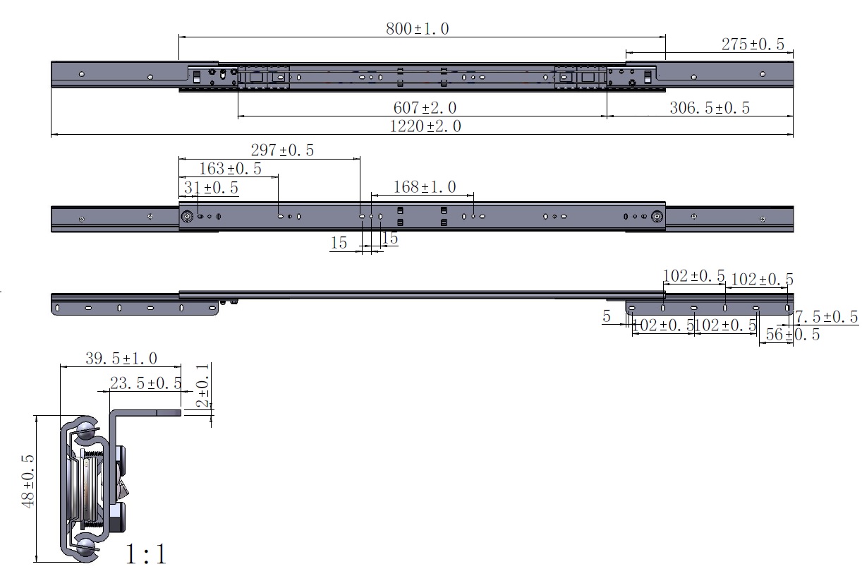 Synchron Slide S 800/607, Opening 607mm, Wing 275mm, Lenght:1220mm, Closed Lenght:800mm, Opening:607mm, Profile Height: 48mm, 2,0mm Steel, Mounting Height 50mm, Load Capacity 90 KG