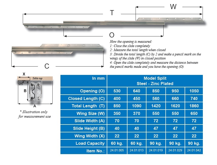 Table Extension Split "S" 640mm Opening, Zinc Plated, Closed Lenght: 460mm, Wing Size: 370mm, Total Lenght When Open: 1120mm, Load Capacity: 60 Kg