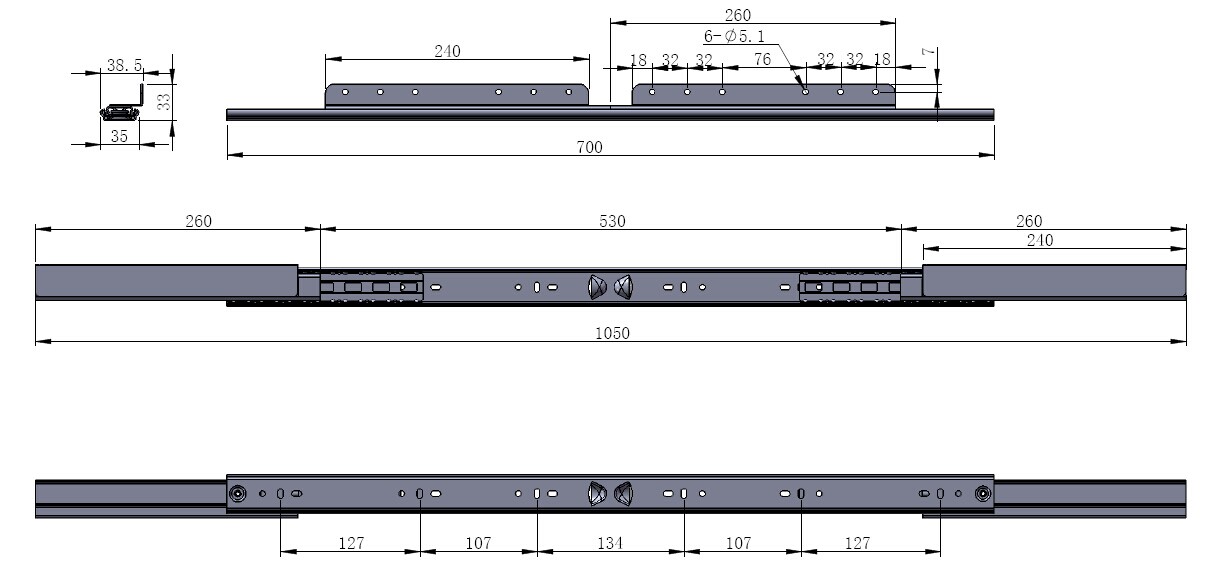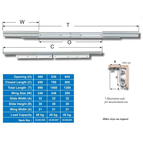 Table Extension 9097-B, Opening 530mm, F/Sliding Top, BZP, Closed Lenght: 700mm, Wing Size:240mm, Total Lenght When Open:1050mm, Load Capacity 45Kg, Profile Height 35mm, 1,5mm Steel