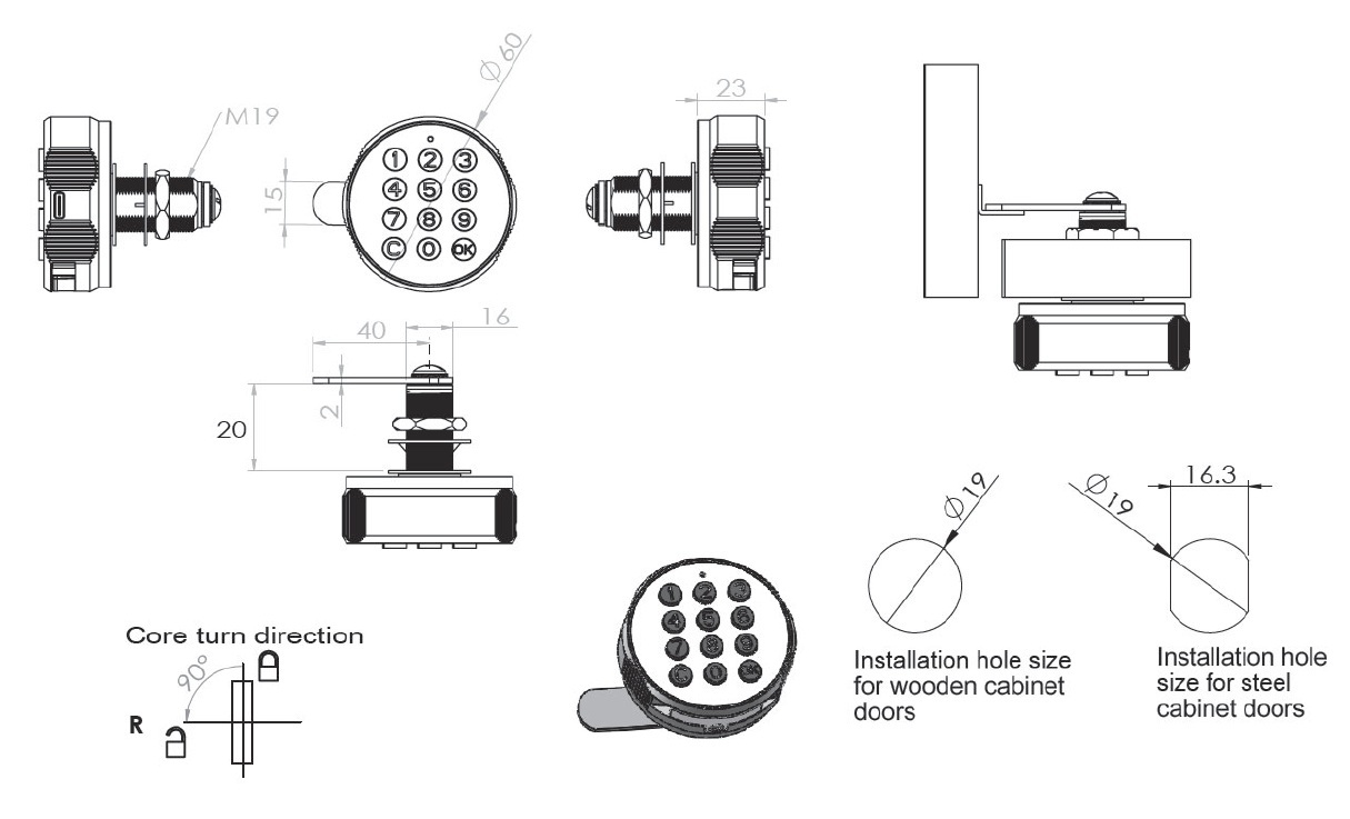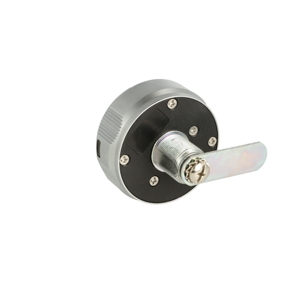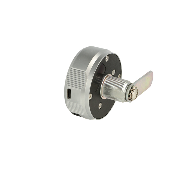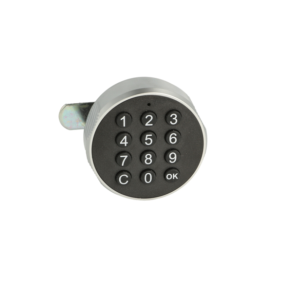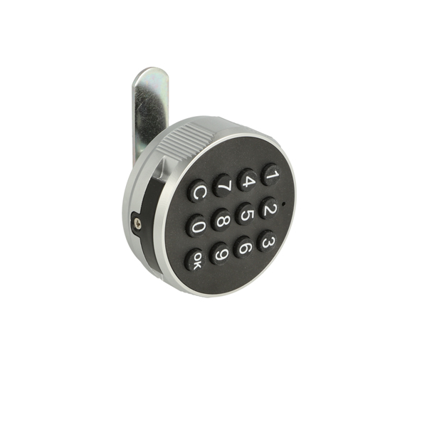 Elec. Key Pad Cam Lock "Phil", RH,ø19x20mm,ø60mm,Zamak Knob, Silver/Black, Straight Cam A04 ce: 40mm, 90 Degree Turn Public/Private, Powered by CR 2450 Battery (Not included W/USB C Plug for External Power Supply