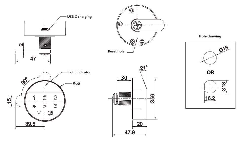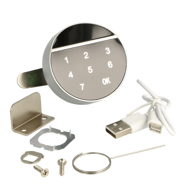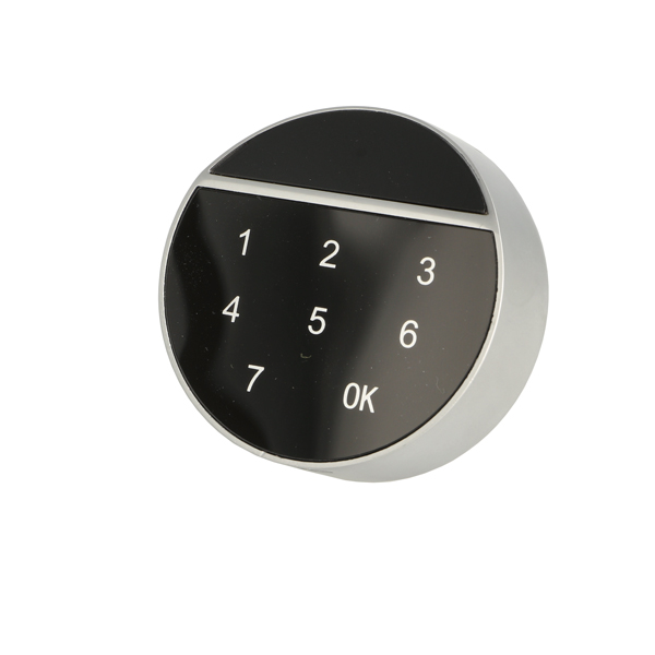 Elec. Touch Pad Cam Lock "Mary", ø19x30mm, ø55mm,Zamak Knob, Silver/Black,W/USB C Charging Cable,Straight Cam ce: 39,5mm, 90 Degree Turn, W/Build-in Lithium Battery, Public/Private