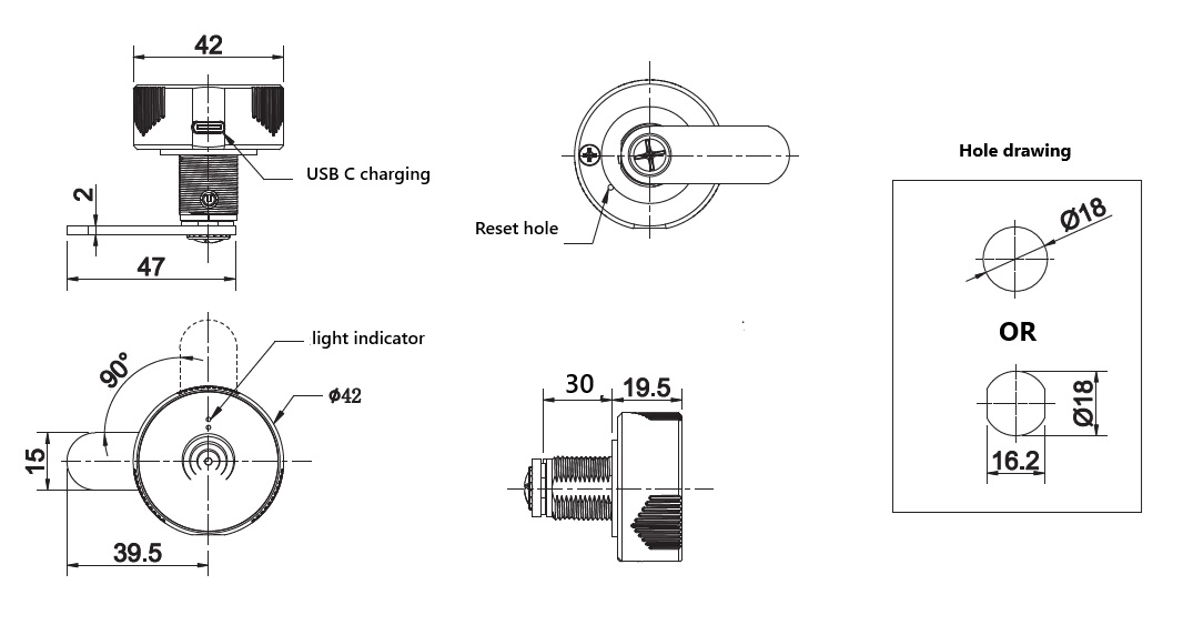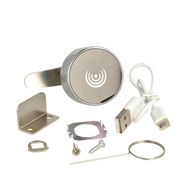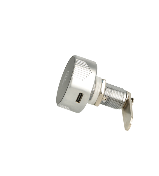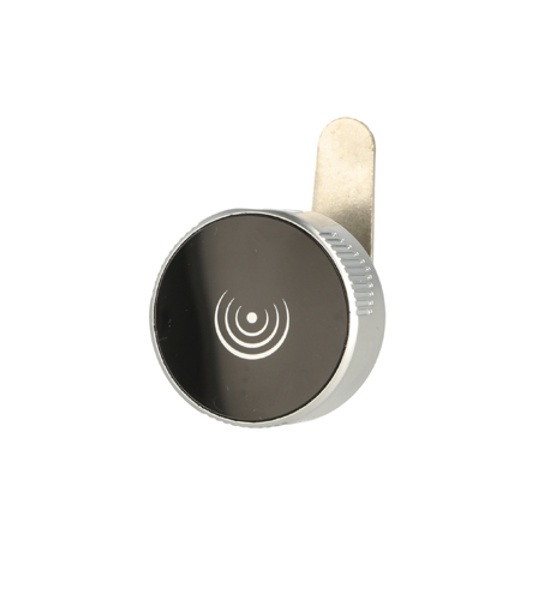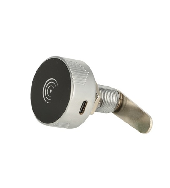 Elec. Mifare1 Cam Lock "Isa", ø19x30mm, ø42mm, Zamak Knob, Silver/Black,W/USB C Charging Cable,Straight Cam ce: 39,5mm, 90 Degree Turn, W/Built-in Lithium Battery, Public/Private