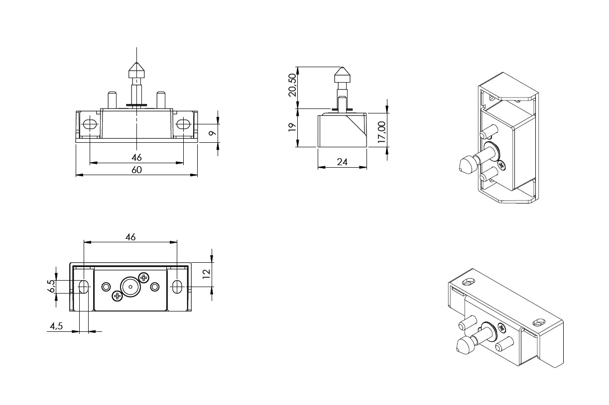 Striker,PTO,F/Mifare1 Lock "Mini",F/Sliding & Cabinet Doors, 60x24x17mm, Black Plastic, Protection Cover to be bought Separately