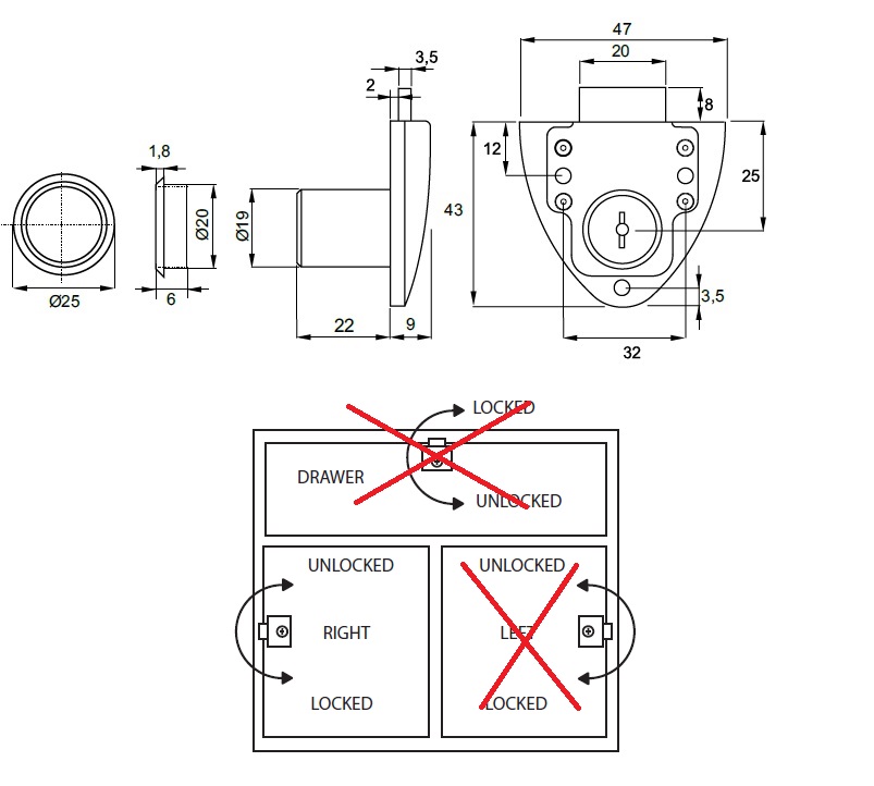 Rim Lock MIC850-N, ø19x22mm,Body Only,#J11+#J12, Right, NPL