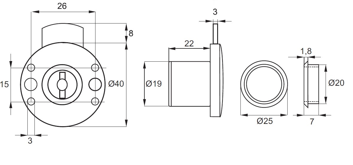 Rim Lock MIC853N, ø19x22mm, Drawer, NPL, HCK SISO, #J11, W/4 NPL Screws