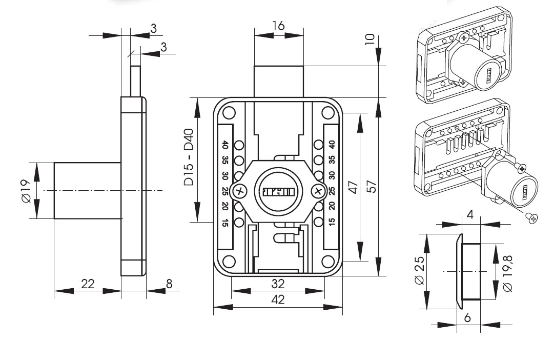 Rim Lock MIC965, ø19x22mm, Right, NPL, HCK SISO,#J11, KA:D20 Adjustable Cylinder, Backset 15,20,25,30,35 or 40mm, Pre-installed to 25mm