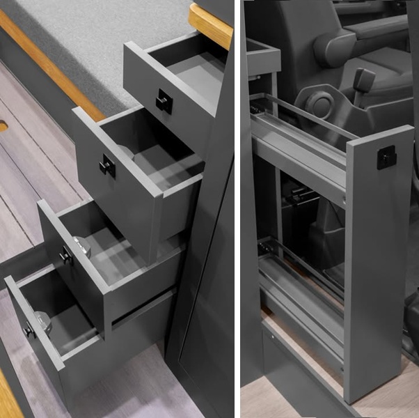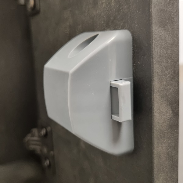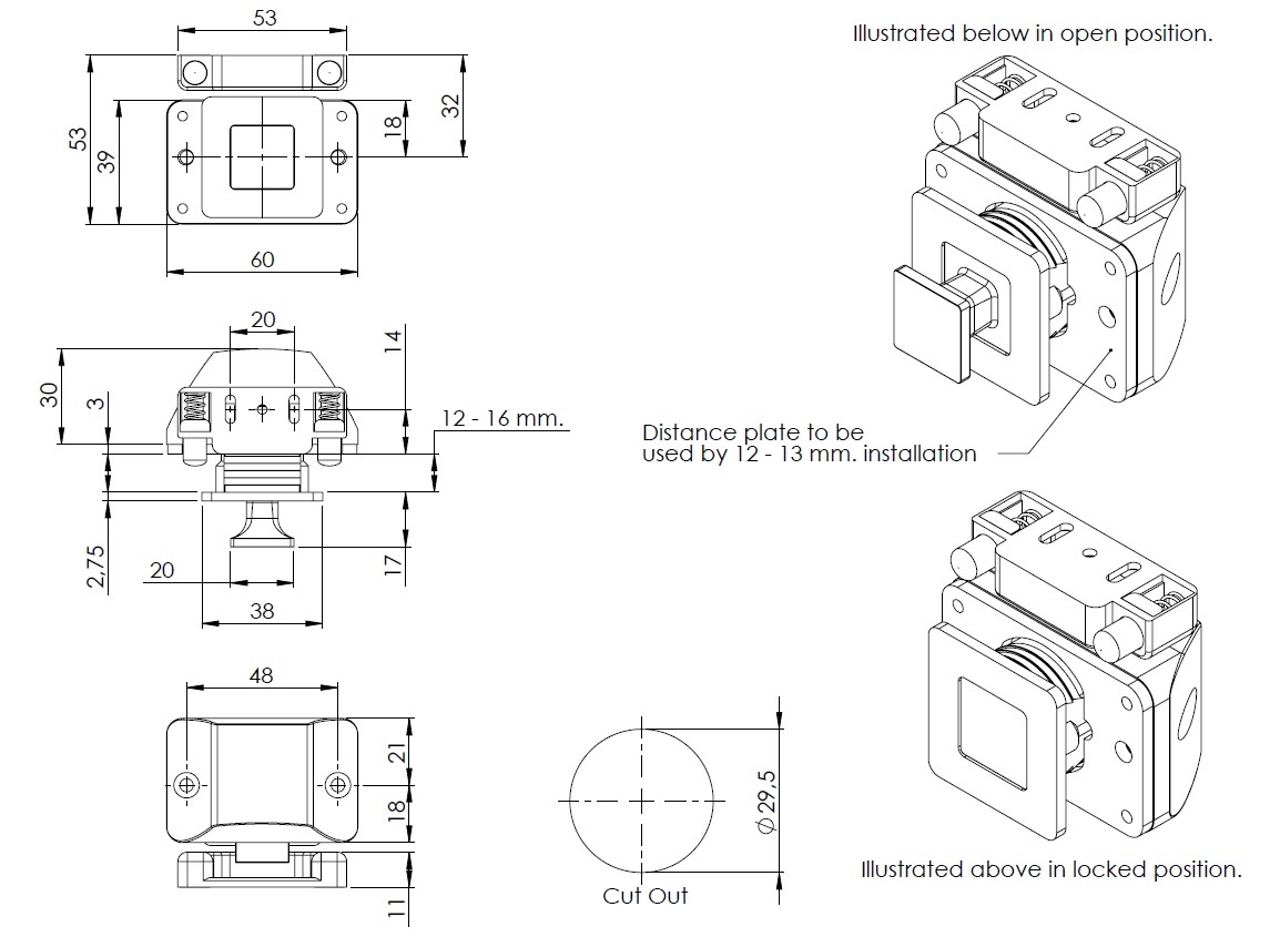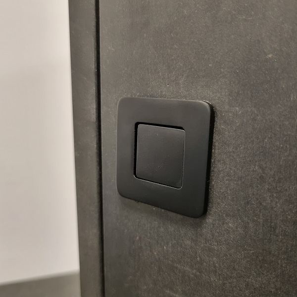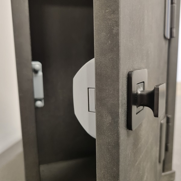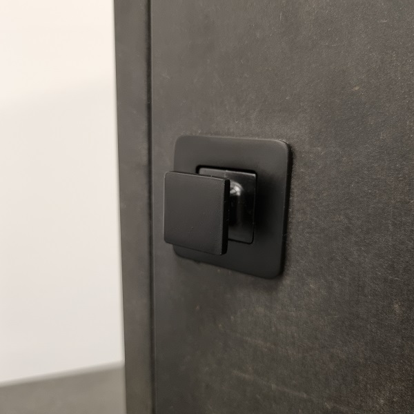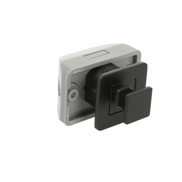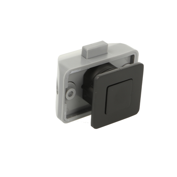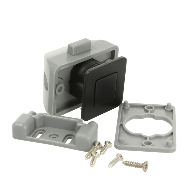 Push Lock "RV", F/12-16 mm, Black, Square Zamak Knob & Grey ABS Housing, Incl. Grey ABS Spring Tension Striker & 3mm Panel Reduction Spacer in Grey ABS