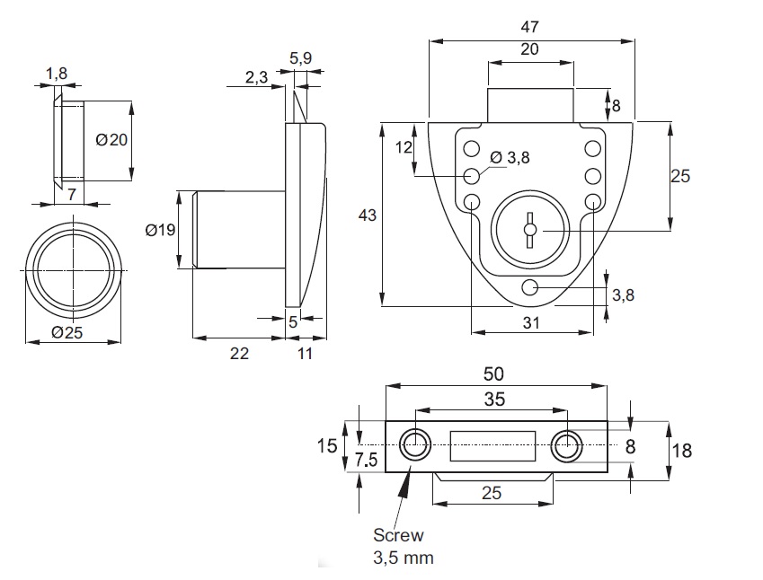 Slam Lock 856N, ø19x22mm, NPL, CK SISO, W/3 Screws, W/ Striking Plate