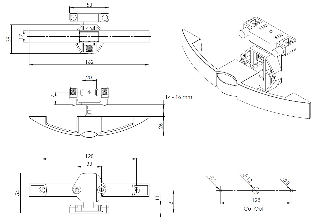 Slam Lock Handle "RV", 14-16mm, cc128mm, BLK, Zamak Handle & Grey ABS Housing, Incl. Grey ABS Striker W/Spring Tension