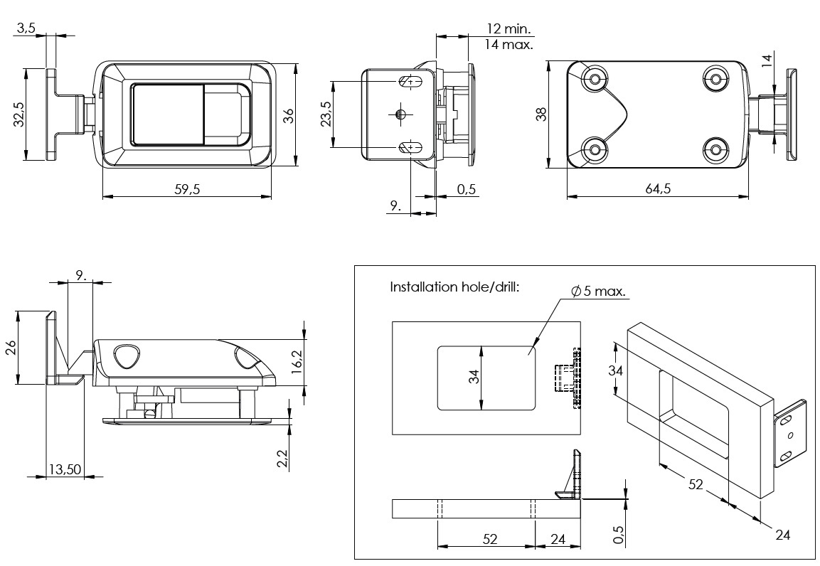 Slam Lock "Wagon", W/Pull Latch, 65x38mm, CPL, 12-14mm,Zamak Handle & Black ABS Body, Incl. Black ABS Striker