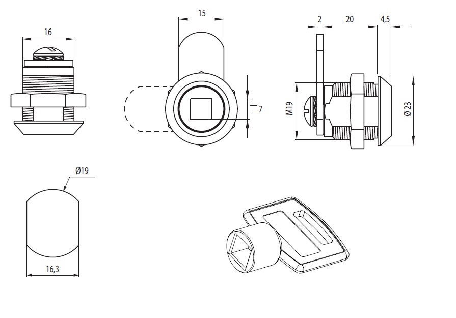 Cam Lock 1920, 90DG, W/Square Zamak Bit Key, Cam A01, CPL Max. 12mm Panel Thickness