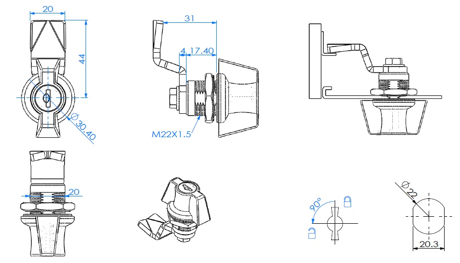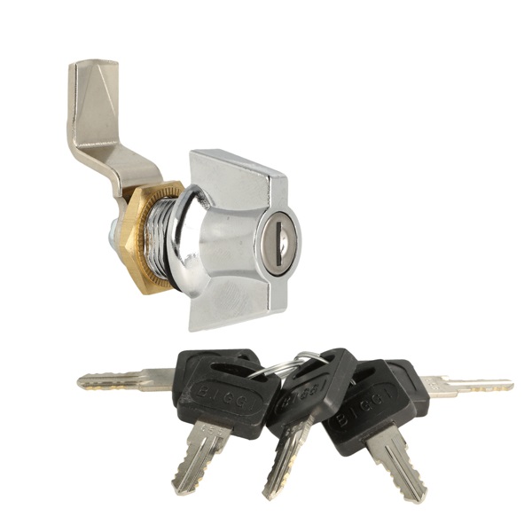 Cam Lock "Biggi" ø20x18mm, CPL, Dust Cover + Special Grip,W/ Cranked Cam 15mm ce:45mm, W/Black Washer & Brass Hex Nut, W/5 Car Keys W/Biggi Logo