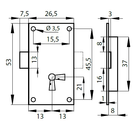 Cupboard Lock "Afric", Steel YZP, 51x26mm, L+R, 10KD, W/2 Neutral Zamak Keys, For Vertical & Horisontal use