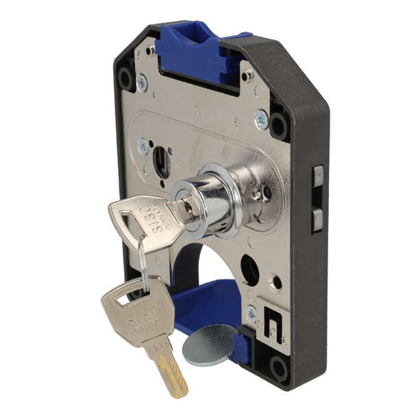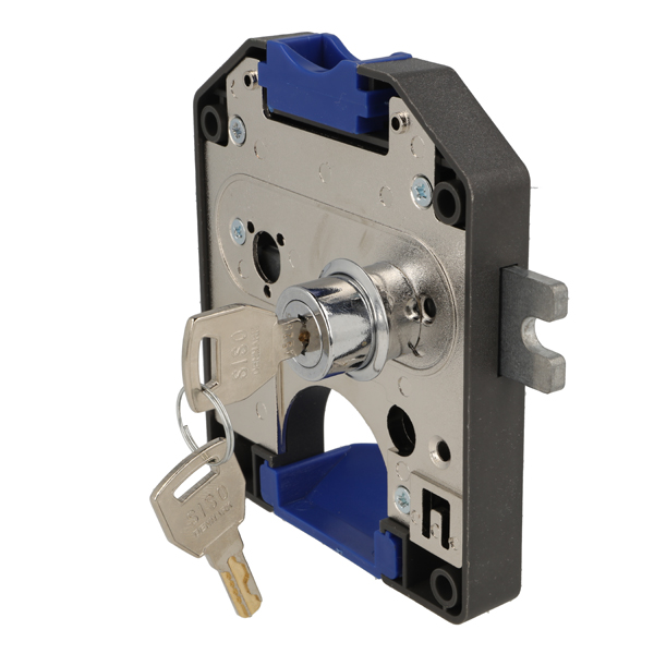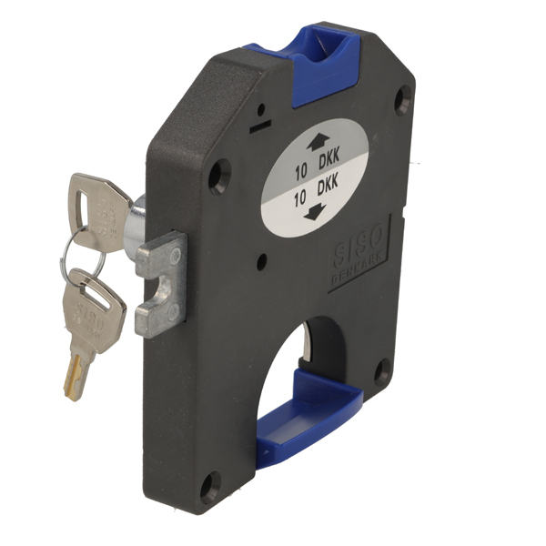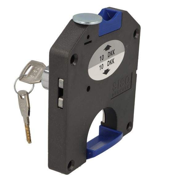 Coin Lock F/10 DKK,W/MIC System #01,CPL,LH, Snake SISO Metal Keys, Black Plastic Body, Coin Entrance & Exit All Blue Plastic, W/SISO Logo on Lock Body, w/Chrome Plated Rosette