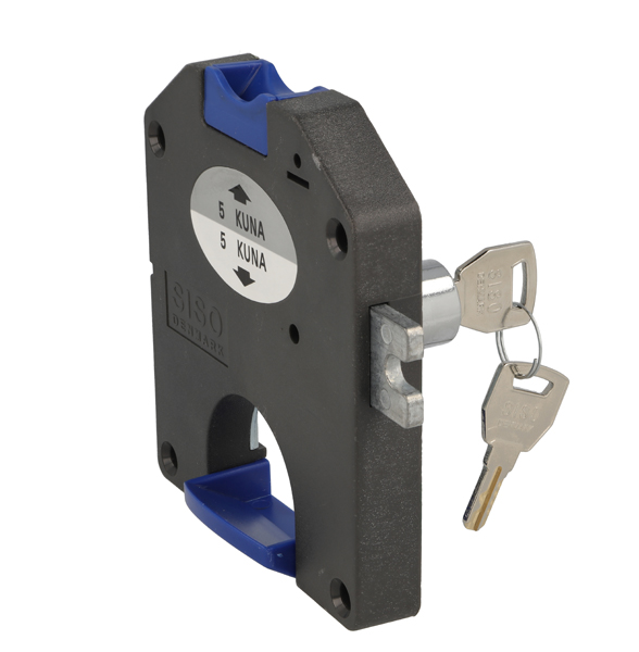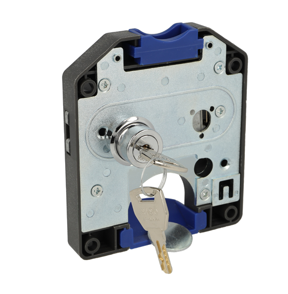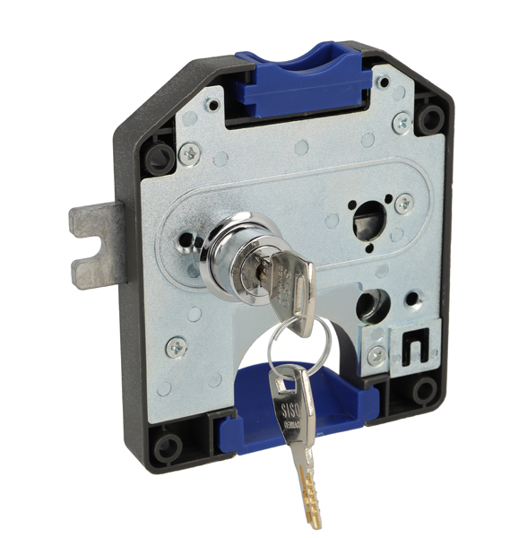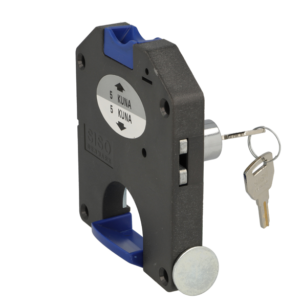 Coin Lock F/2 Leva, W/MIC System #01,CPL,RH,Snake SISO Metal Keys, Black Plastic Body, Coin Entrance & Exit All Blue Plastic, W/SISO Logo on Lock Body, w/Chrome Plated Rosette