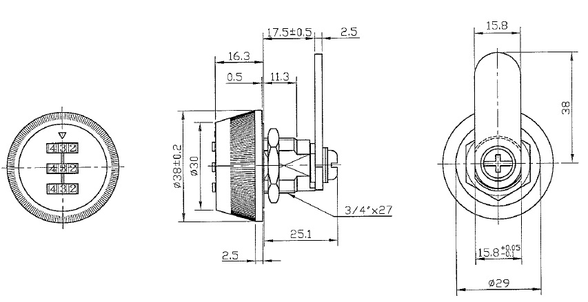 Combi. Cam Lock "Dome", 90DG, ø19x17.5mm, CPL, Straight Cam Centre To Edge 38mm, Universal - Left & Right in one Lock