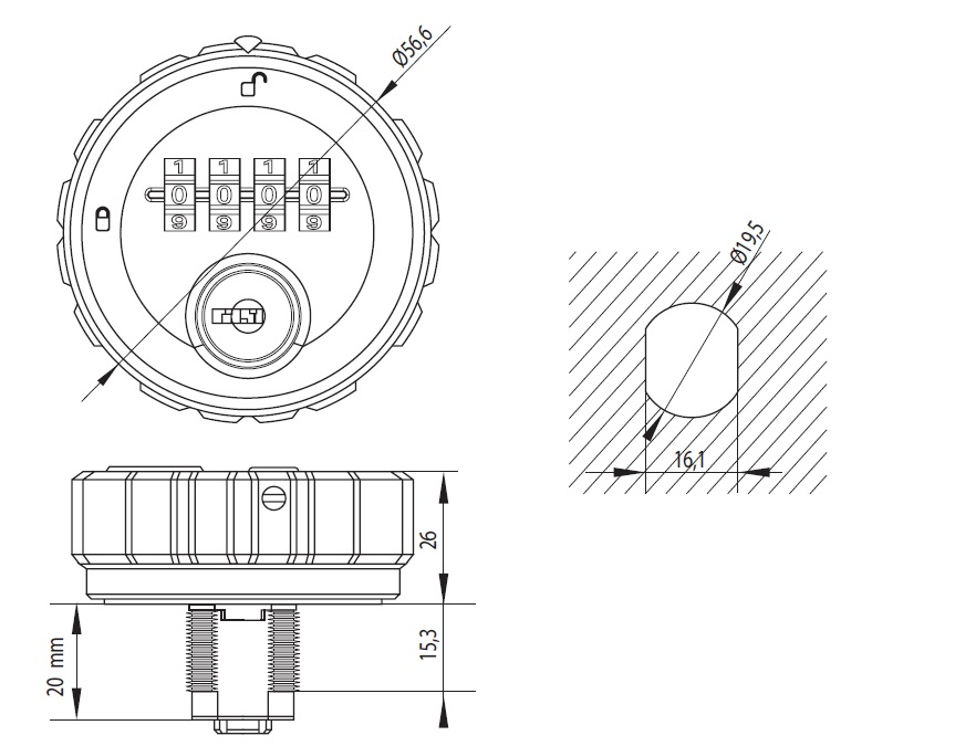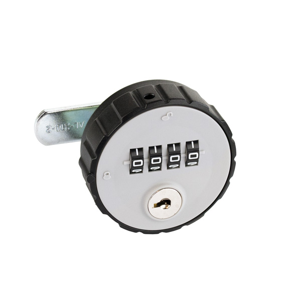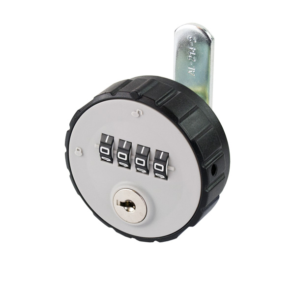 Combi. Cam Lock M215,4-Digit,RH,ø56,6x20,35mm,Black/Grey, 90 DG, Ø19X20mm Cylinder, Straight Cam,C/E:40mm, W/Hex Nut,Pre- Coded 0000, Changing Code By Pressing Metal Pin On Side of Housing into the Housing in Open Position, Master Code A201