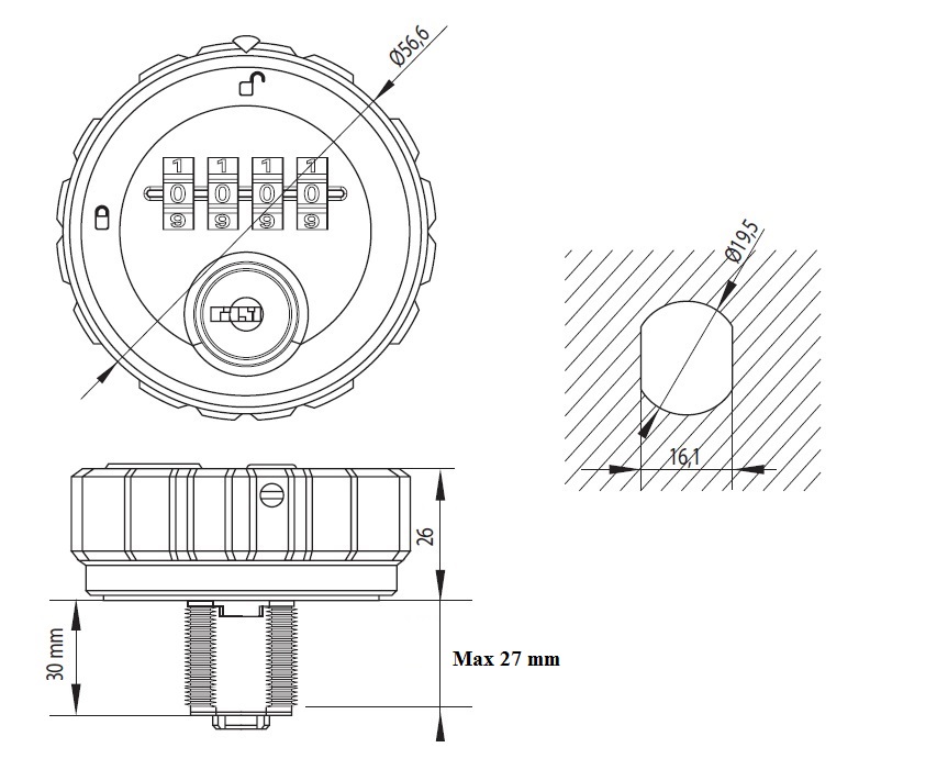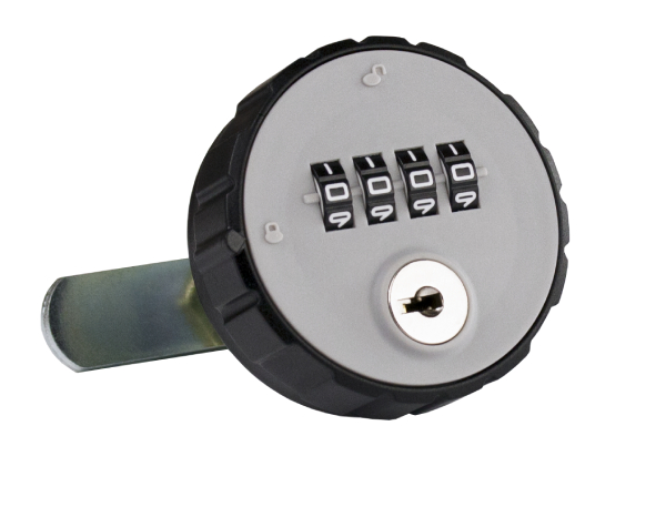 Combi. Cam Lock M215,4-Digit,RH,ø56,6x30,35mm,Black/Grey, 90 DG, Ø19X30mm Cylinder, Straight Cam,C/E:40mm, W/Hex Nut,Pre- Coded 0000, Changing Code By Pressing Metal Pin On Side of Housing into the Housing in Open Position, Master Code A201