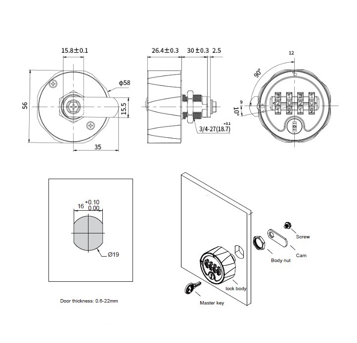 Combi. Cam Lock M500, Private, 4-Digit, ø19x30mm, RH ,White Zamak, ø56x26,5mm Housing, 90DG, Straight Cam, C/E:35mm, W/Hex Nut, Pre-Coded 1111, Changing Code By Turning Lock Body 10DG Counter Clockwise,Code Finder by use of Master Key Code #08, With Scramble Function, Door Thickness 0,6-22mm