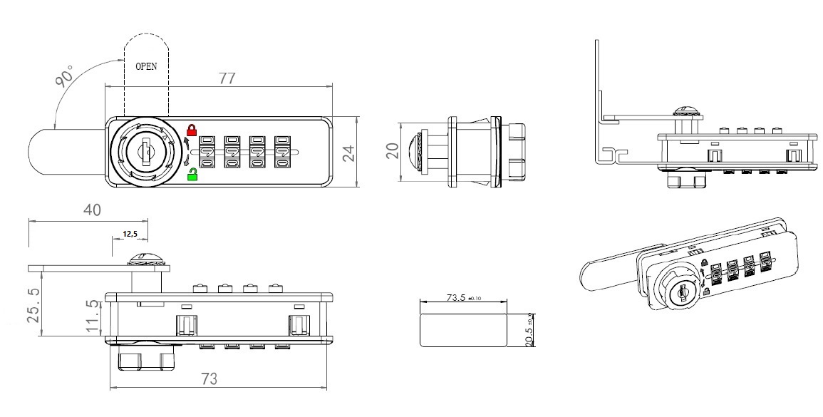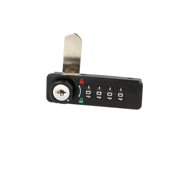 Combi. Cam Lock M906, Private, 4-Digit, RH, 90DG, MK+Code Finder, Black, 73X20X15,5mm, Straight Cam C/E:40mm, Closed 9´Clock, Open 12 O´Clock, Pre-coded 0000, Master Key System #J13, Cylinder Centre to Edge of Lock Body: 12mm, F/0,8-1,0mm Metal Panels Thickness, Horizontal Installation